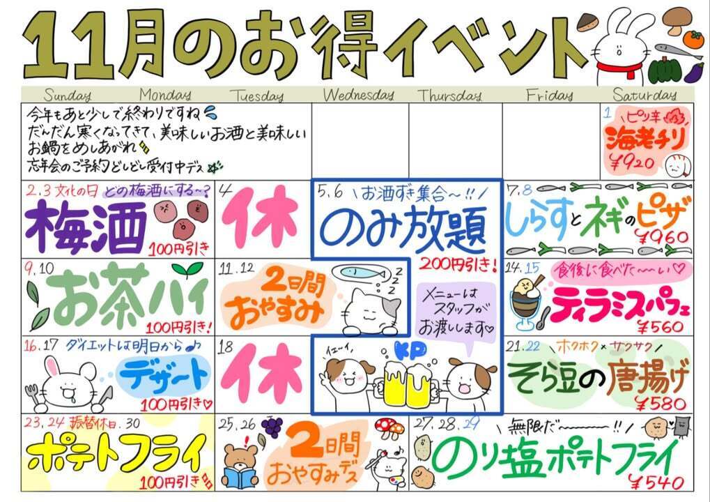 11月も日替わりでイベントを開催し、皆さんに少しでも楽しんで頂けたらと思っております☺️