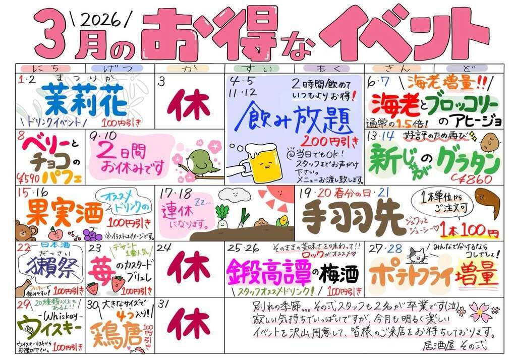 久しぶりの投稿になってしまいすみません💦3月のイベントカレンダーが完成致しましたので、お知らせです- ̗̀📣