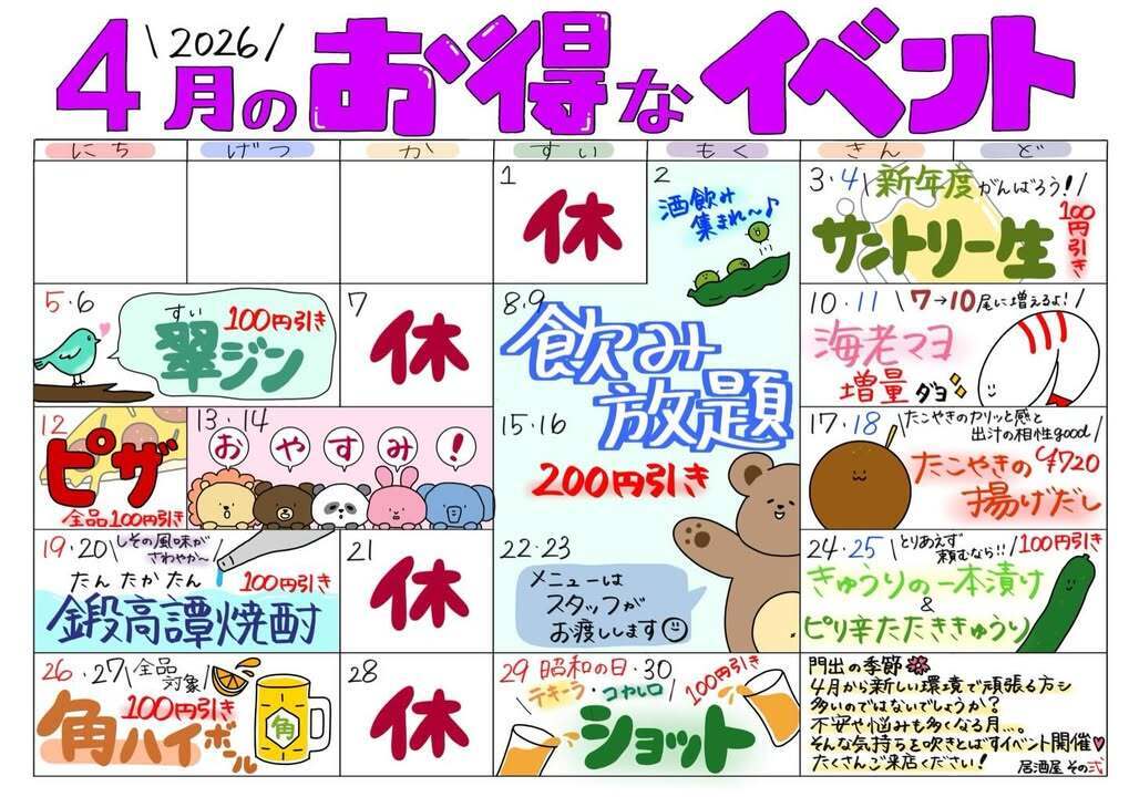 🙌4月のイベントカレンダーが完成致しましたので、お知らせです🙌